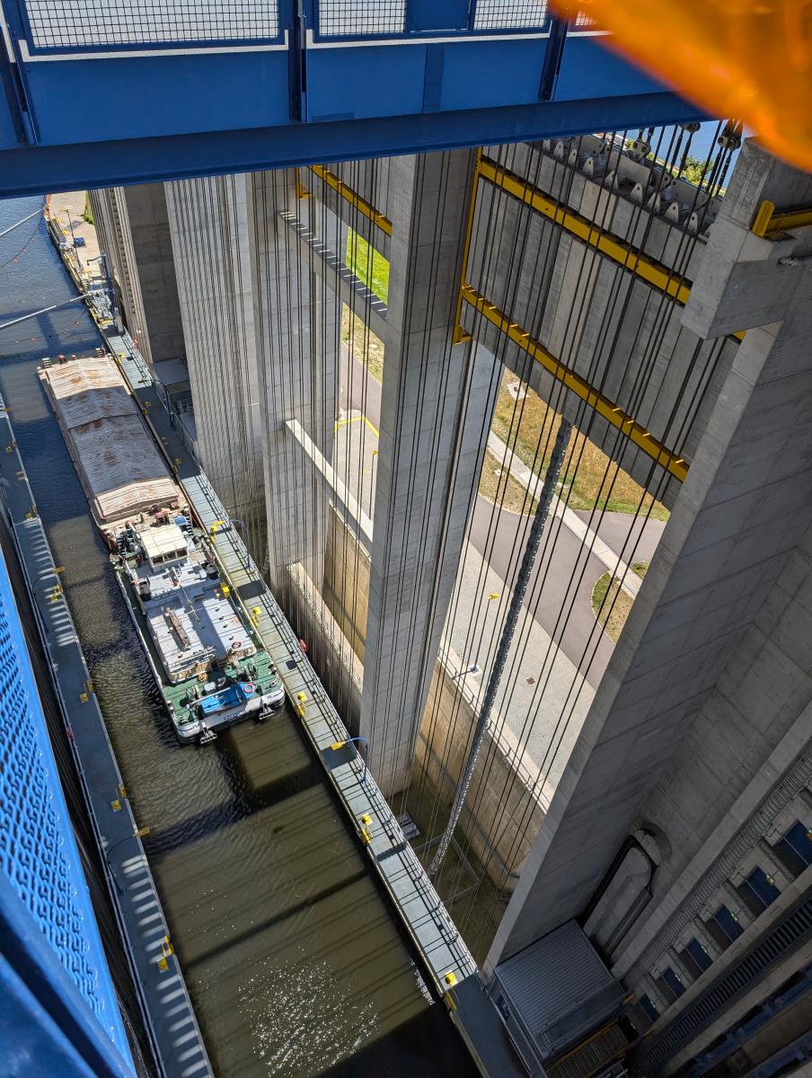 Podnośnia (nowa) ma wysokość 54.50 metra, długość wanny dla statków to 115 metrów, a masa wanny z wodą to 9800 ton. Więcej szczegółów jest na Wikipedii